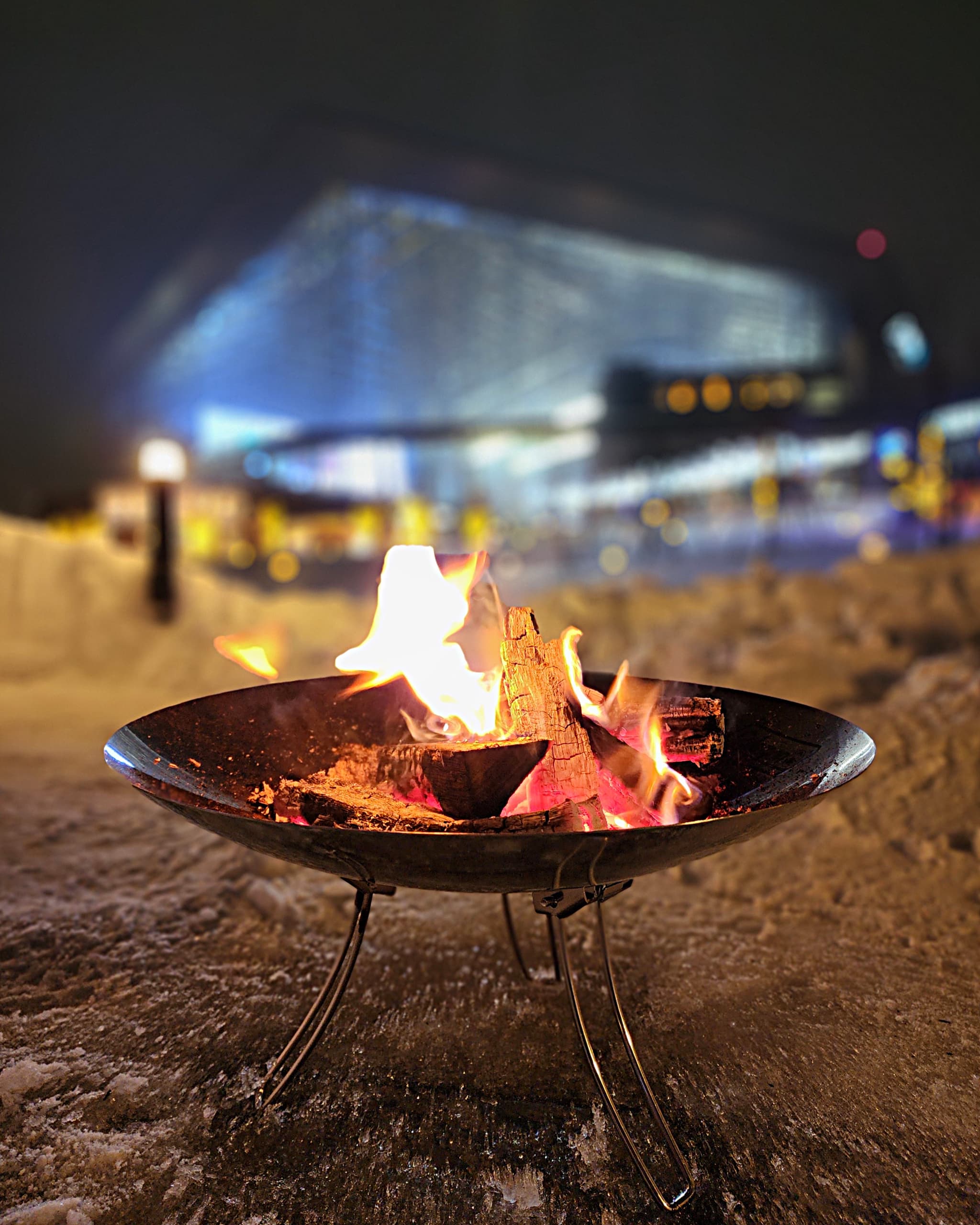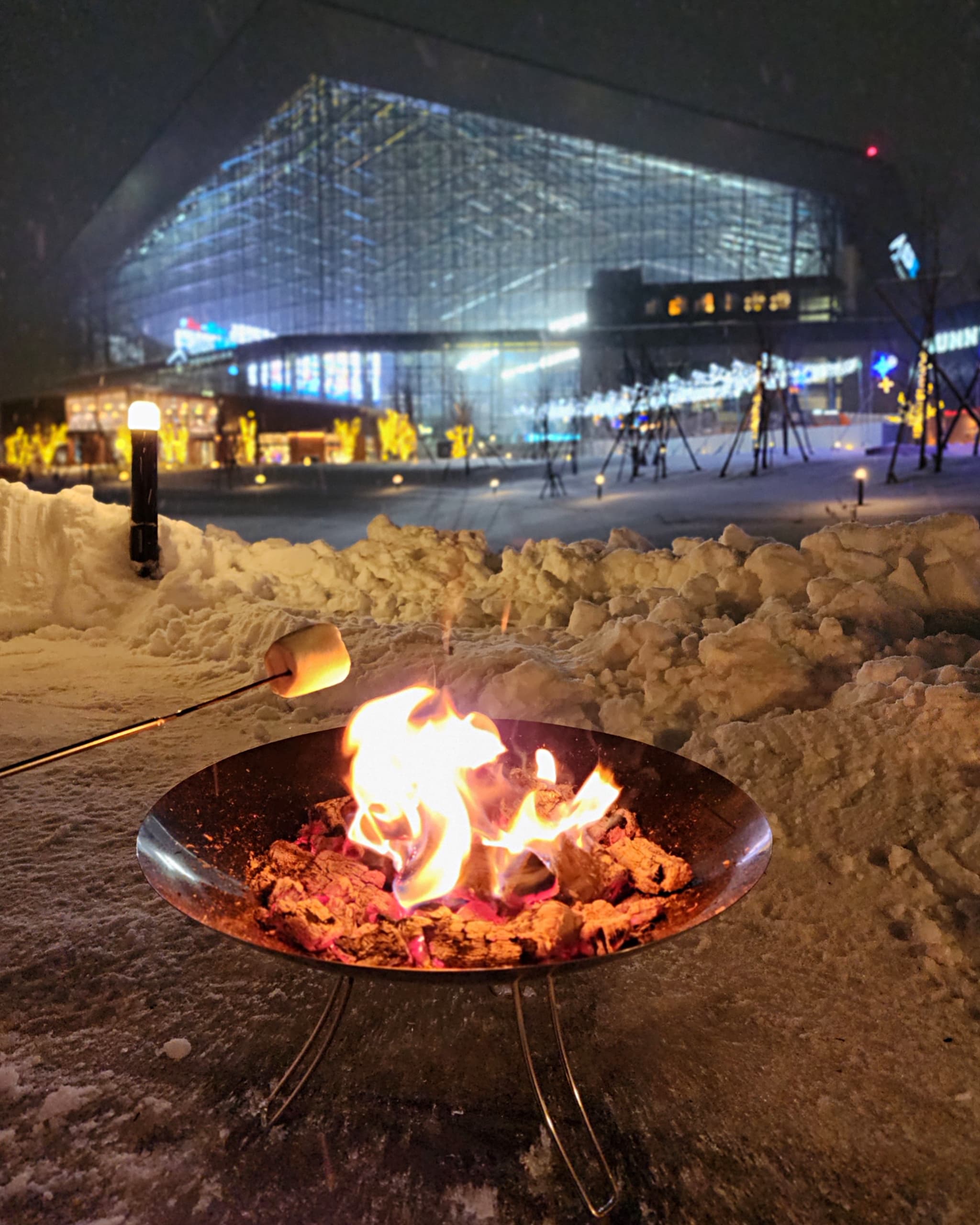 冬の静寂に包まれた夜のエスコンフィールドを背景に心まで温まる焚火体験を。